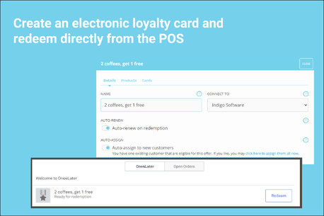 Electronic stamp card – Create an offer and set a target, ie Buy 9 Coffees get 10th Free. When a customer reaches the target the reward is automatically available and redeemed through the POS.